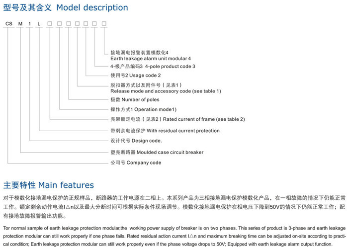 CSM1L(CM1L) 帶剩余電流保護塑殼斷路器,額定絕緣電壓800V。適用于交流50Hz, 額定工作電壓400V,額定工作電流至630A的電路中作不頻繁轉換及電動機不頻繁起動之用。具有過載、短路和欠電壓保護功能,保護電路和電源設備不受損壞。能對過電流保護不能檢測出的由接地故障而可能引起的火災危險提供保護。