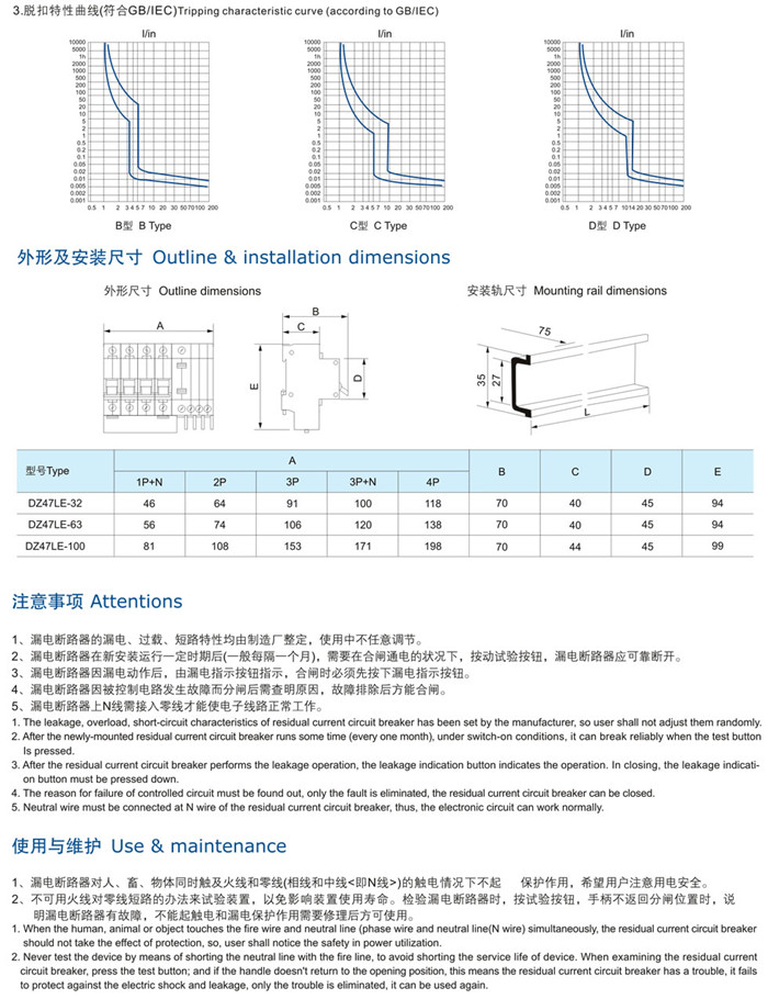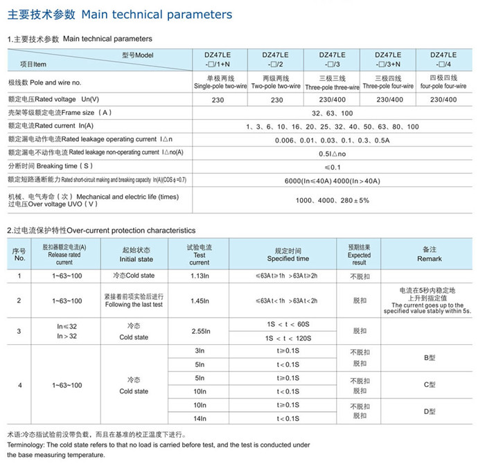 DZ47LE-63系列漏電斷路器,適用于交流50Hz或60Hz,額定電壓單相230V,三相400V及以下,額定電流1-100A電路中,當人身觸電或電網泄漏電流超過規定值時,漏電斷路器能在極短的時間內迅速切斷故障電源,保護人身及用電設備的安全,同時具有過壓、欠壓、過載、短路等保護功能,亦可作為線路的不頻繁轉換及電動機的不頻繁起動之用。本產品體積小,重量輕,外形美觀,導軌安裝,使用方便。