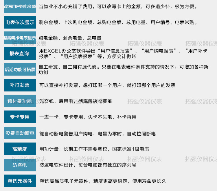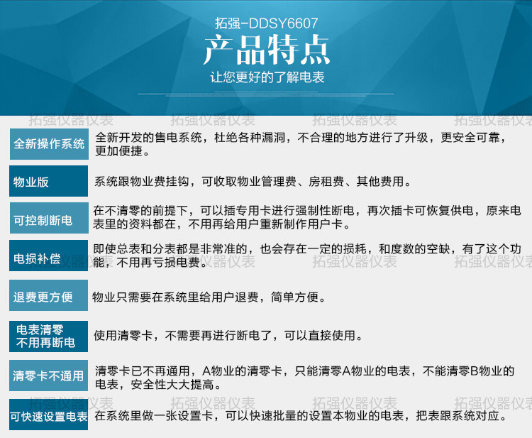 主要特點:應用計算機管理,先購電后用電;在額定電流范圍內(nèi)能限制最大使用功率(由供電部門限定);一表一卡,專卡專用,失卡不失電,補卡再用;電卡能雙向傳遞數(shù)據(jù),能自動斷電告警用戶購電;電量為零時,自動拉閘斷電;并具有一定的防竊電軟件設計等。