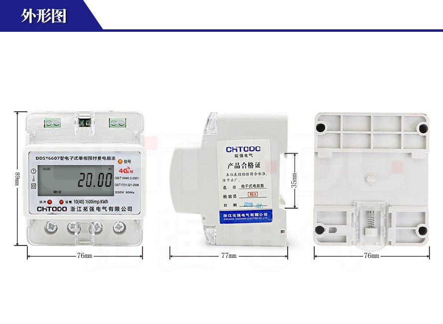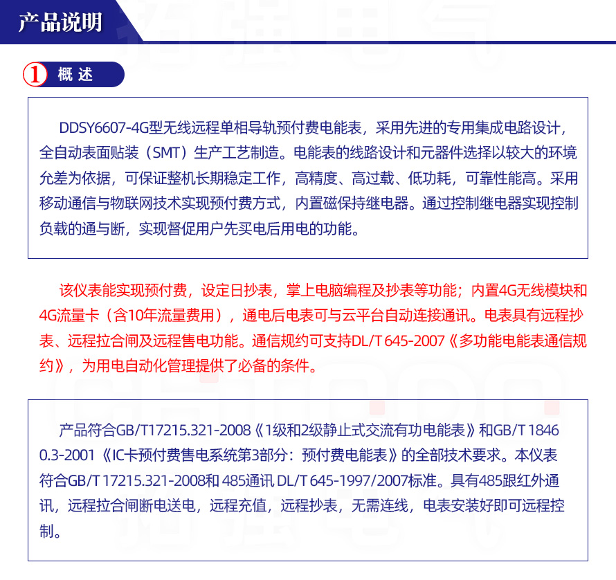 DDSY6607型系列GPRS遠程導軌式單相預付費電能表采用屏蔽式、密封型結構,用單片微控制器進行數據采集,處理和保存。具有良好的抗電磁干擾,低功耗,高準確度了,高過載,長壽命。安全符合GB/T17215-2002、GB/T18460.3-2001和DL/T645-1997標準中對電子式單相預付費電度表的全部技術要求。