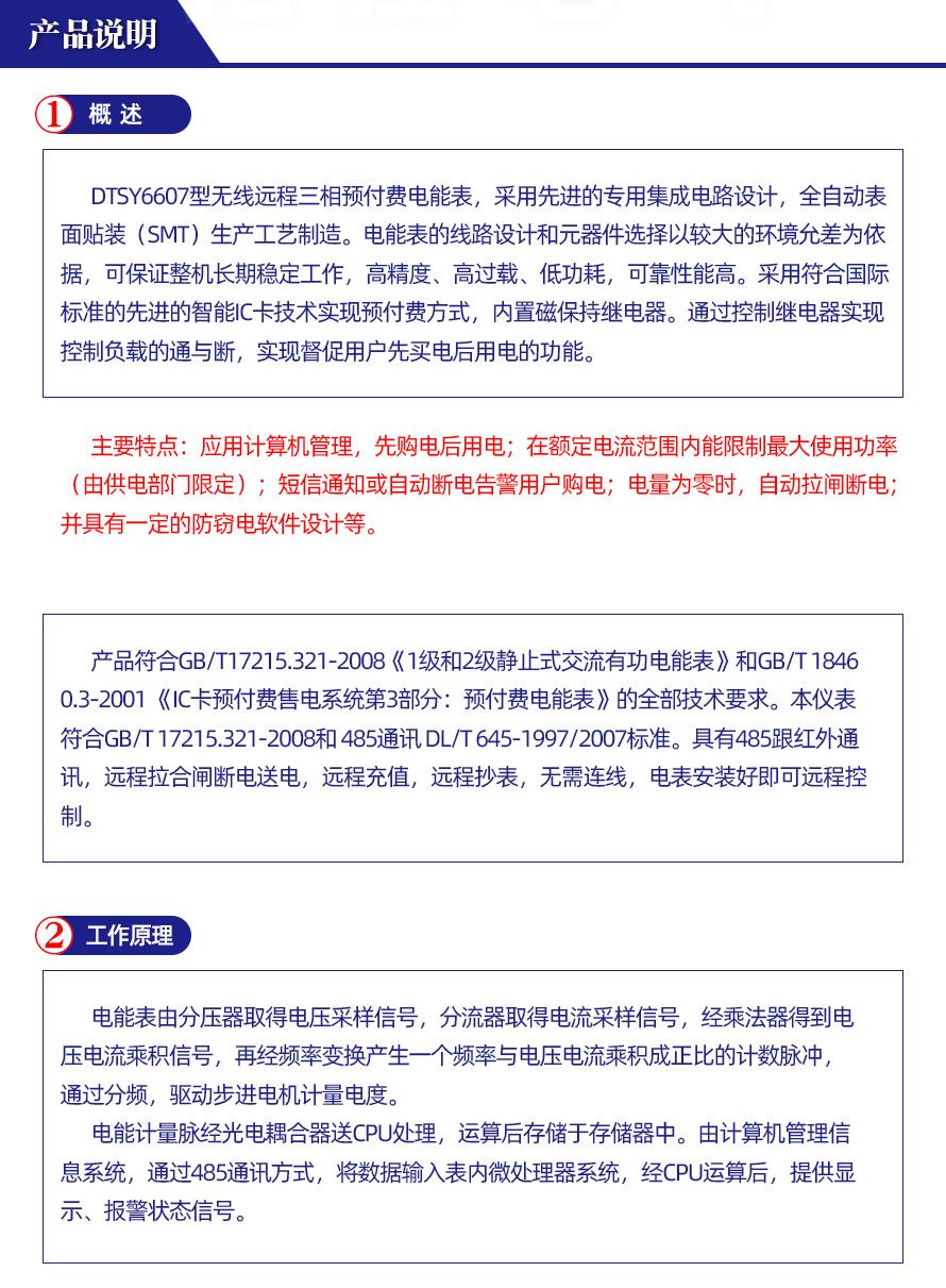 其性能指標符合GB/T 17215-2002《1級和2級靜止式交流有功電度表》中對電子式有功電度表的技術要求,符合GB/T15284-2002《多費率電能表 特殊要求》對復費率電能表的技術要求,并符合GB/T18460-2001《IC卡預付費售電系統》的各項技術要求。