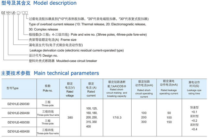 DZ101LE系列漏電斷路器是由DZ10塑料外殼式斷路器派生而成,具備斷路器功能外,為了防止人身觸電及線路漏電,在斷路器上加裝漏電脫扣器,設計成具有過載、短路、漏電:種保護為一體的產品。該產品是目前大容量線路器中較為理想的漏電保護電器。并符合IEC75-92、IE947.2國際標準及GB6829-95、CB14048.2-94國家標準。