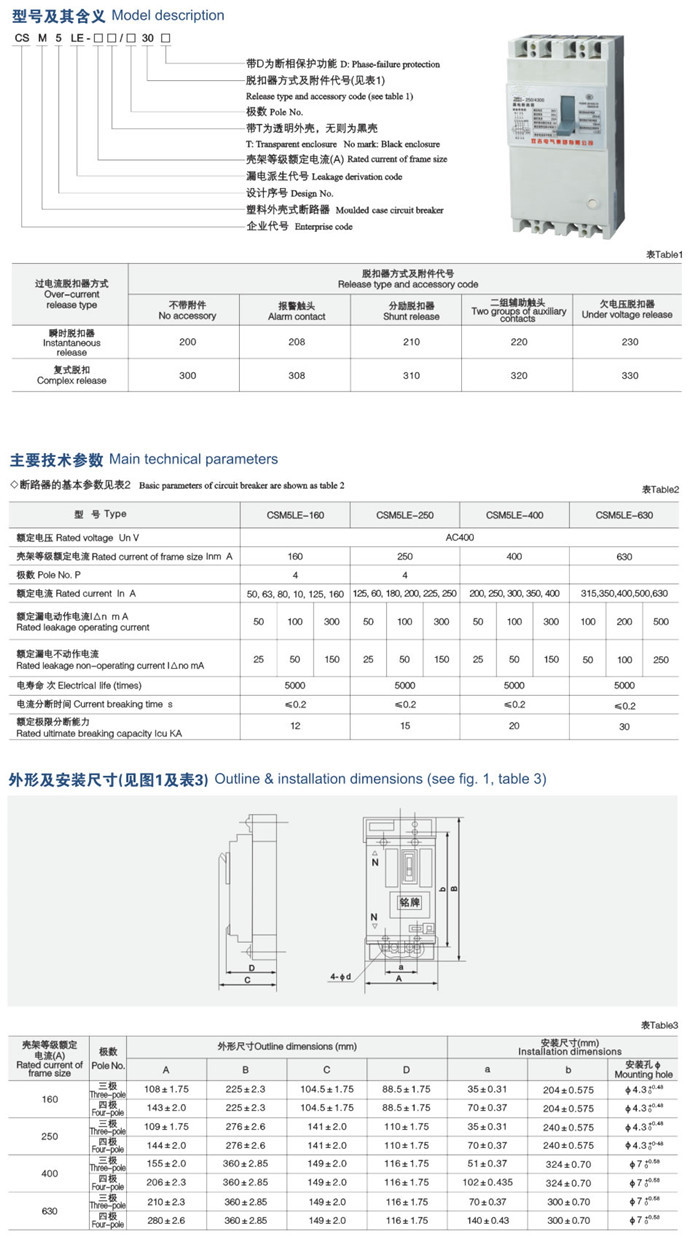 CSM5LE(DZ20LE)系列漏電斷路器適用于交流50Hz、額定電壓400V,額定電流至630A及以下的電路中, 可作為人身觸電、漏電保護用,也可用來防止設備絕緣損壞,產生接地故障電流而引起的火災危險。具有隔離、斷相保護功能,適用于建 筑行業分配電。.并可用來對線路的過載、短路和欠電壓保護,亦可用來對線路的不頻繁轉換之用。